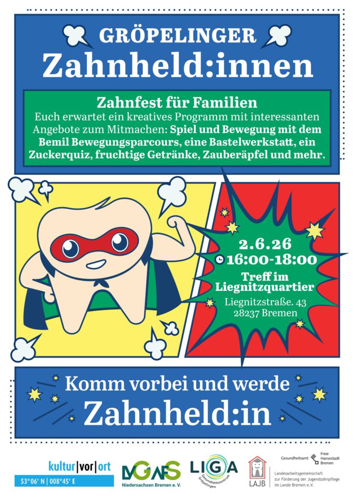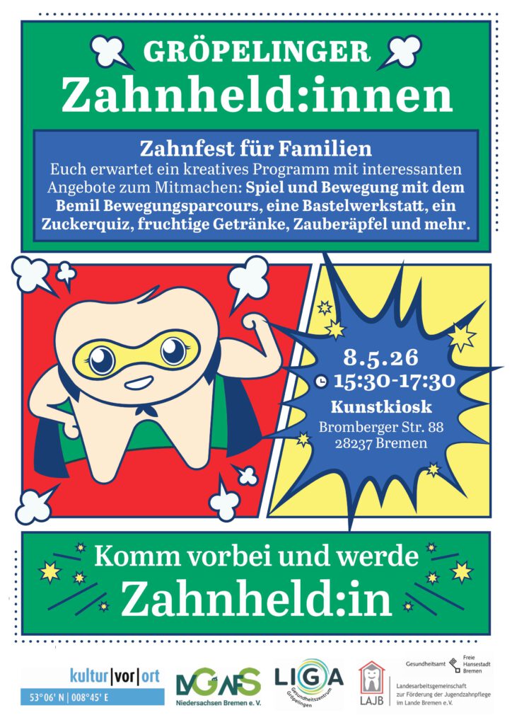 Im Rahmen des Projektes Gröpelinger Zahnheld*innen organisieren wir Zahnfeste für eine Verbesserung der Mundgesundheit bei Kindern und Jugendlichen.