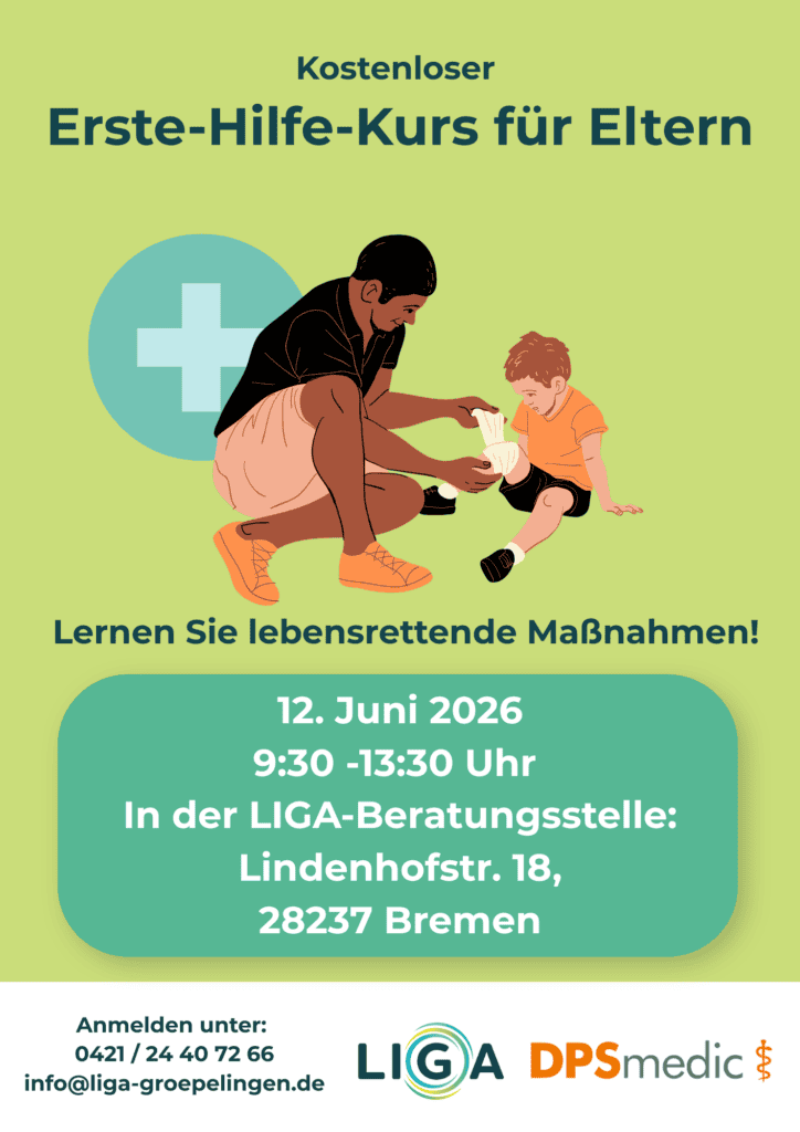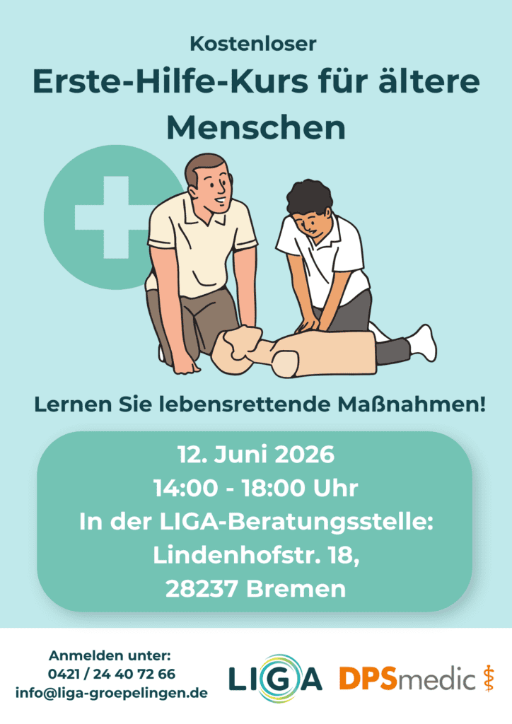 Lebensrettende Sofortmaßnahmen können im Notfall entscheidend sein. Die LIGA Gröpelingen bietet daher regelmäßig kostenlose Erste-Hilfe-Kurse an.